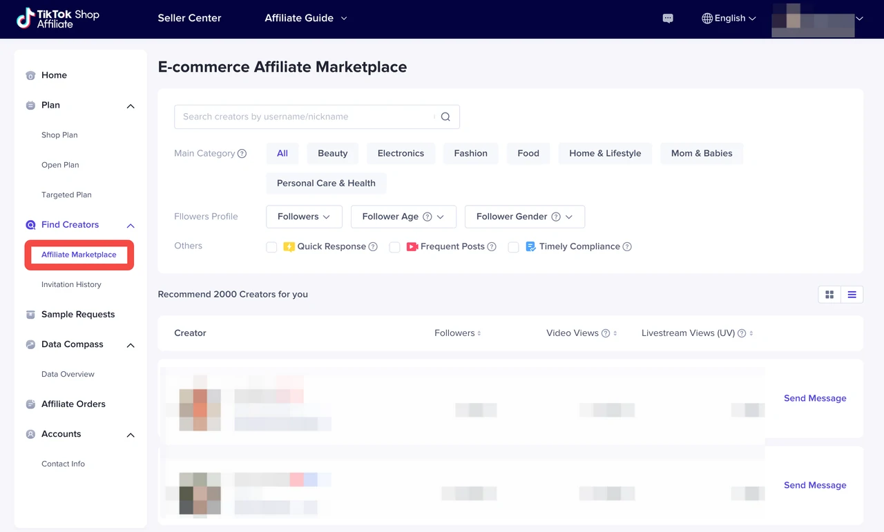 - 登录 TikTok Shop 卖家中心,进入“Affiliate(联盟)” > “Find Creators(寻找创作者)” > “Affiliate marketplace(联盟市场)”。