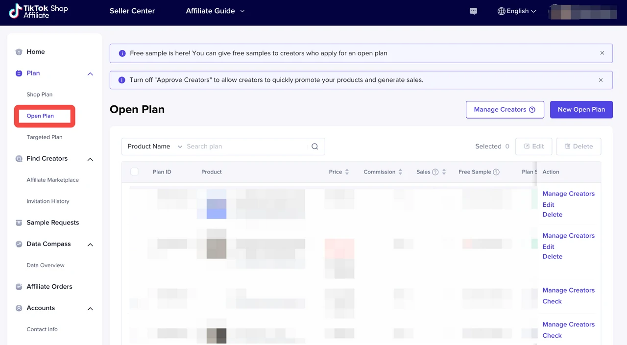 - 登录 TikTok 商店卖家中心,进入“Affiliate(联盟)”页面,然后在开放计划页面顶部点击“New Open Plan(新建开放计划)”。
